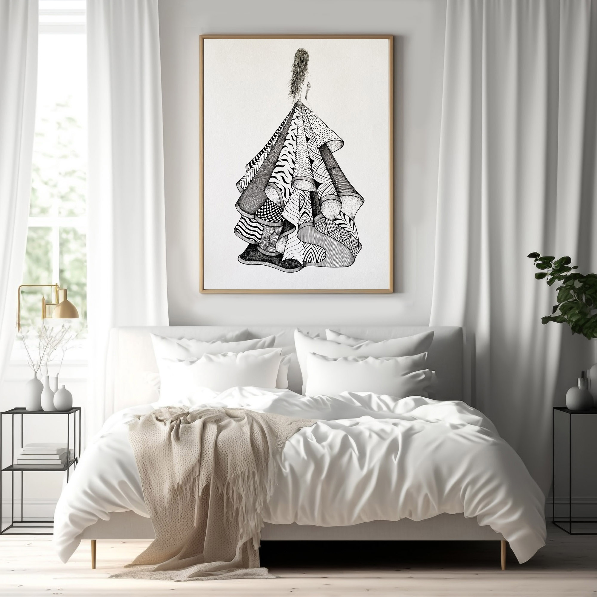 Dreaming of Dresses is a beautiful black and white pen and ink drawing that will add a touch of elegance to any space. With its captivating lines and curves, this piece will bring a calming and peaceful atmosphere to any room. Let Dreaming of Dresses transport you to a whimsical world of beauty and feminine vibes.