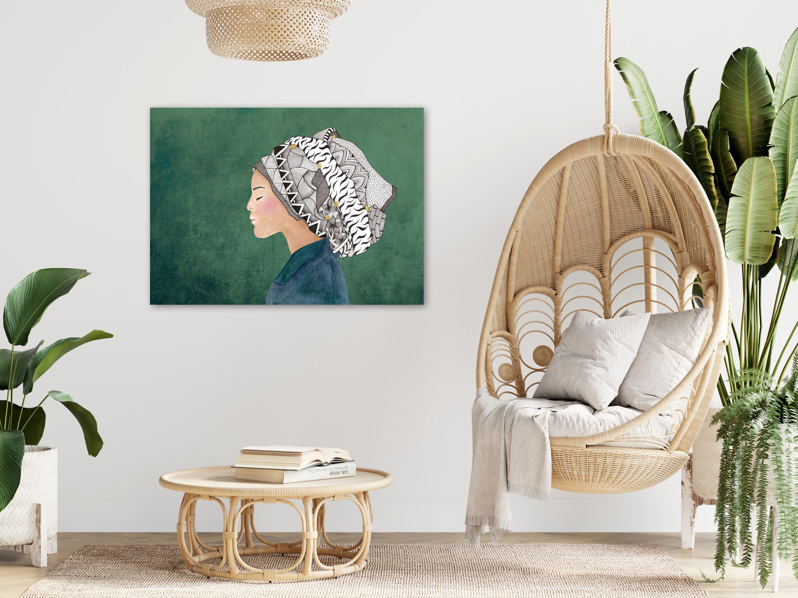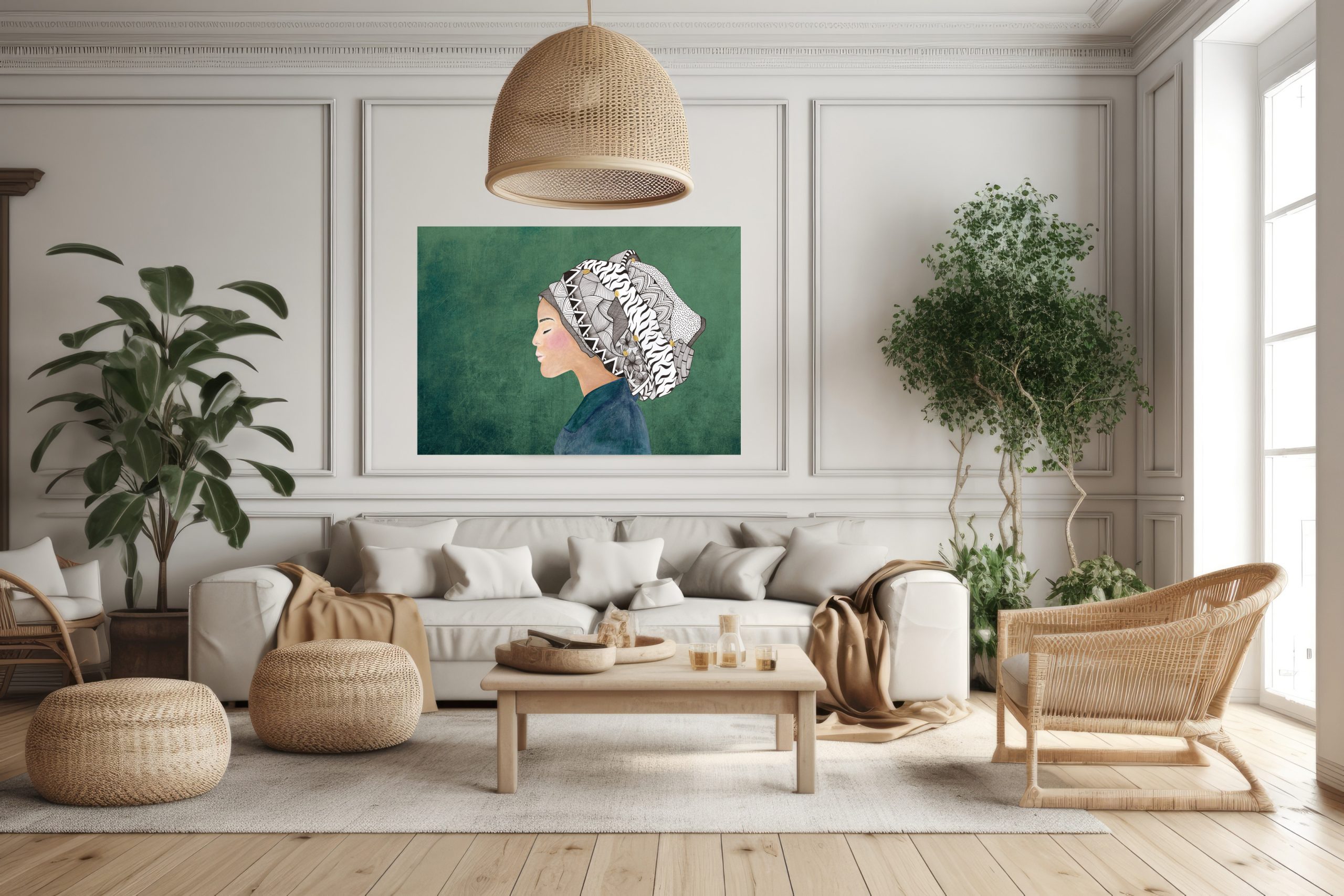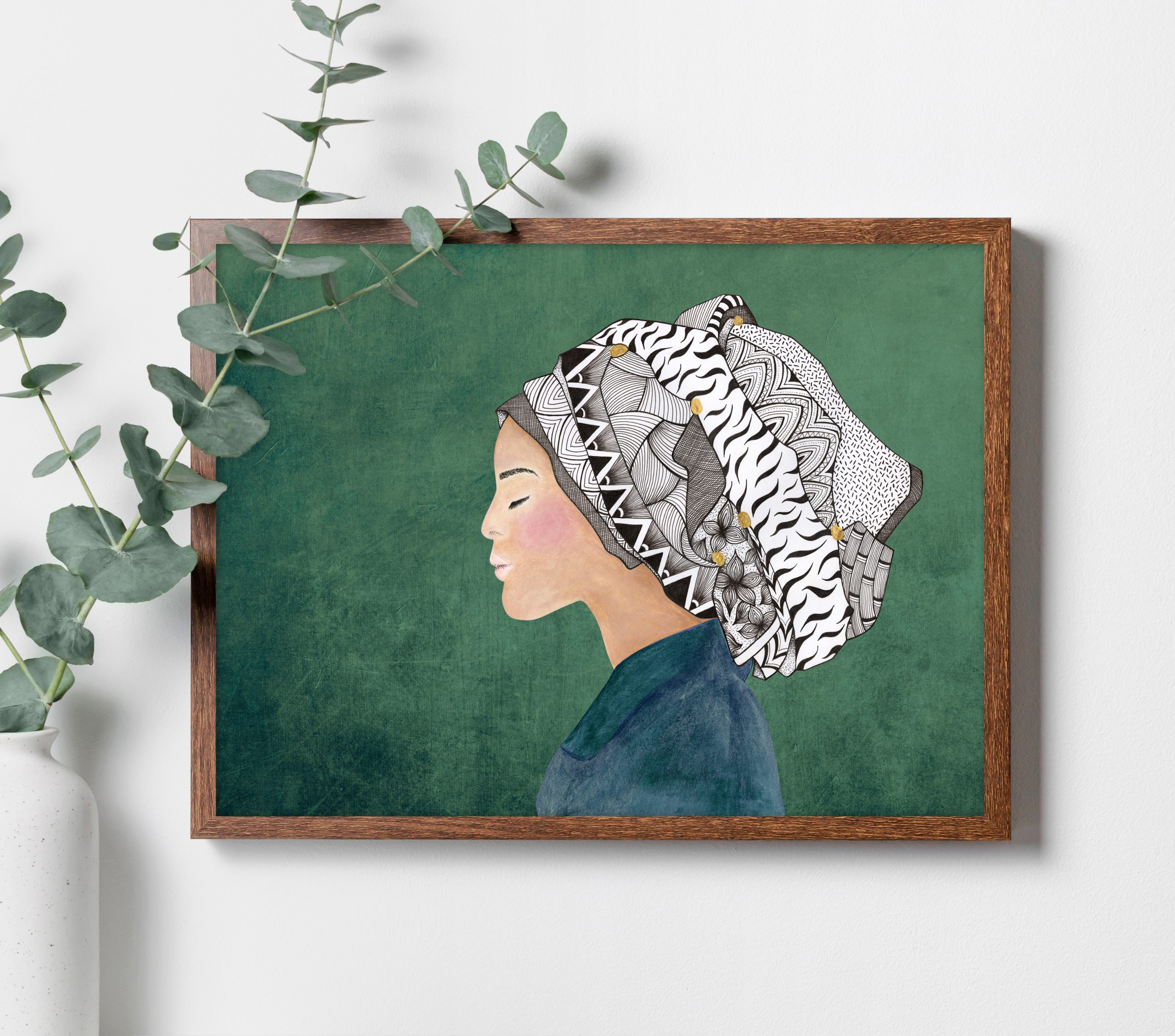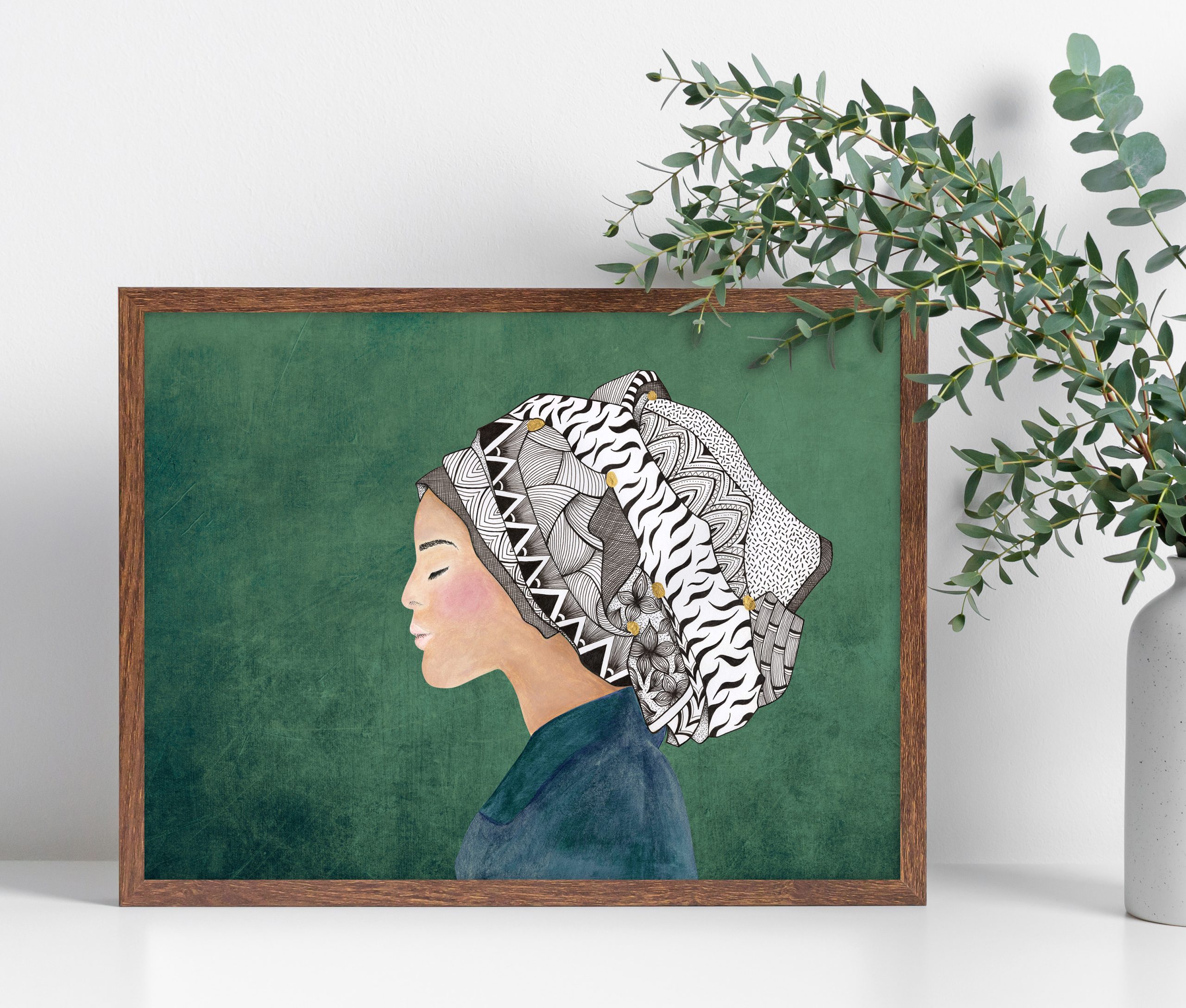 Finding the Calm – Lady in Headdress with Zentangular & African Patterns – mixed media.