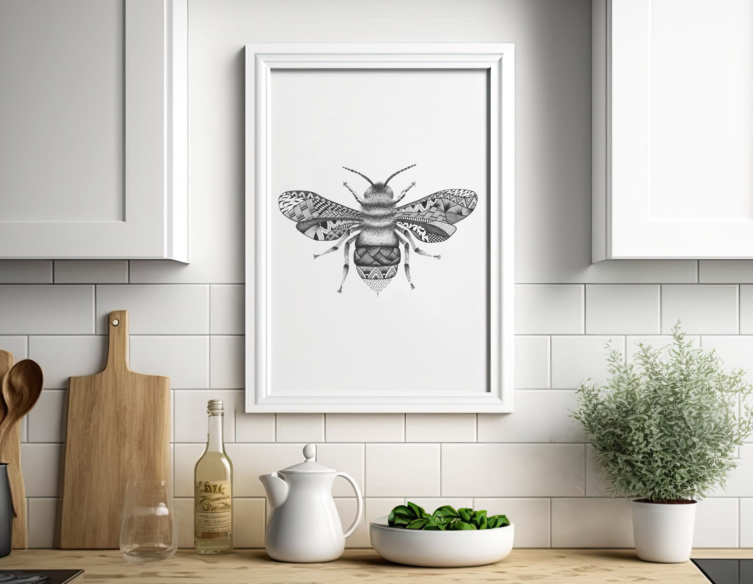The Queen Bee was drawn in black Micron pen on A2 Mixed Media Fabriano paper – 250g. All prints are numbered and hand signed on Felix Schoeller True Rag Etching 310g paper. 100% Cottton, printed with superior Epson Ultrachrome HDX Pigment Inks.